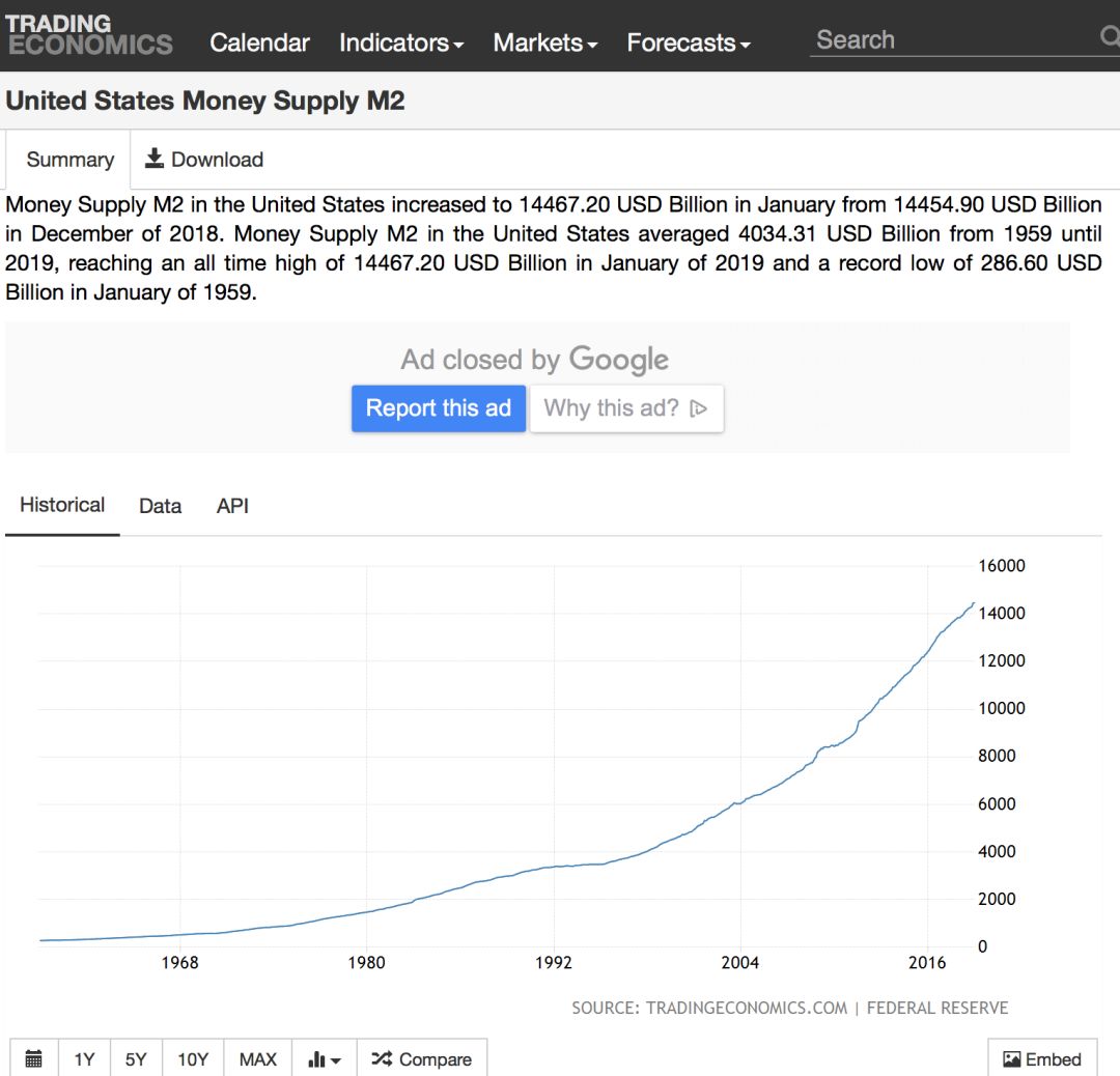 这里稍微讲一下房产投资。虽然多年来,房价(以法币计算)也有上涨,但是房价对于其他商品的涨幅并不明显。房产投资赚的钱,并不主要是房价上涨的钱,而是货币贬值的钱。关于货币的供应量我们可以看个数据。从 1959 年 1 月到 2019 年 1 月,美元的 m2 上升了 50 倍。平均每年是 6.75%。中国这个数字大约是 15%。