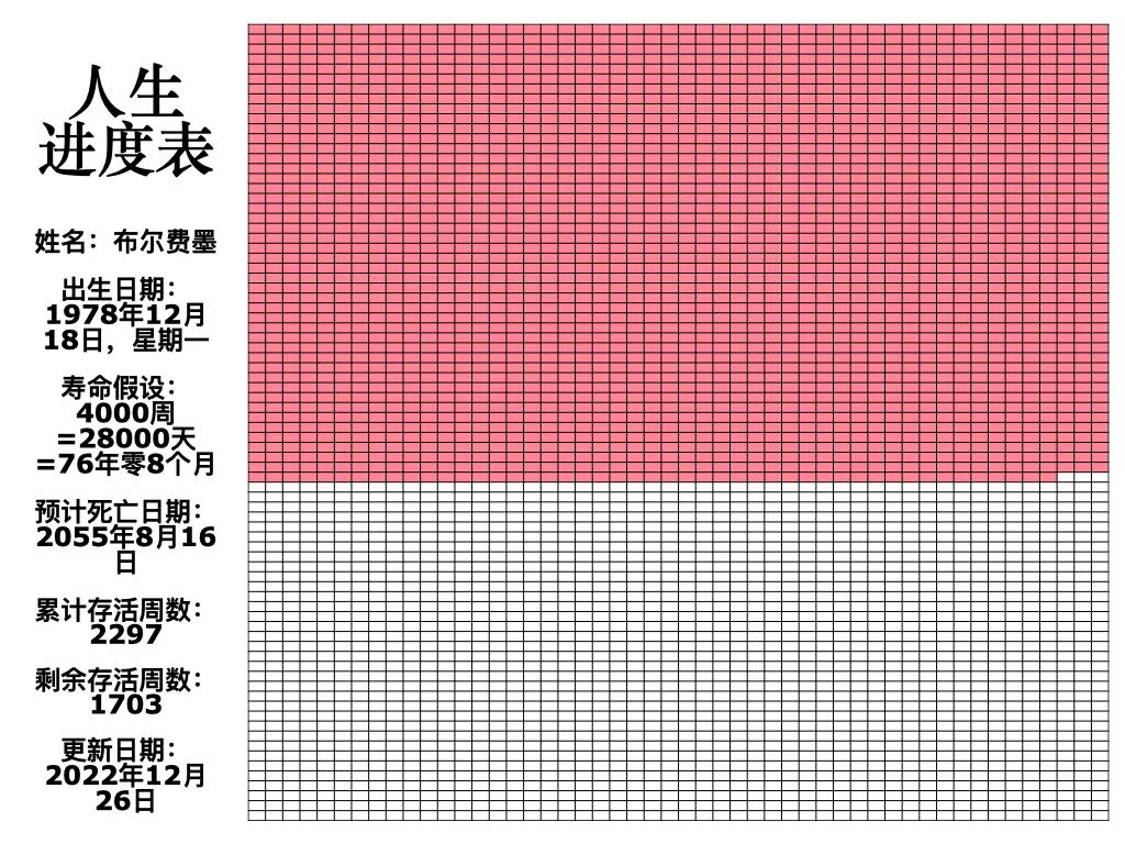 这个表需要每周去维护,这就是它存在的意义。要记得你出生当天是周几。如果不知道,百度可以查到。这样每周一到这个日子你就可以去更新一格。为什么要更新?因为当你觉得你的生命还很漫长的时候,当你觉得你的生命还可以浪费的时候,你看到这个表就会意识到,时间过去一格有多么的容易。而我们的人生,本来就不剩下多少格。