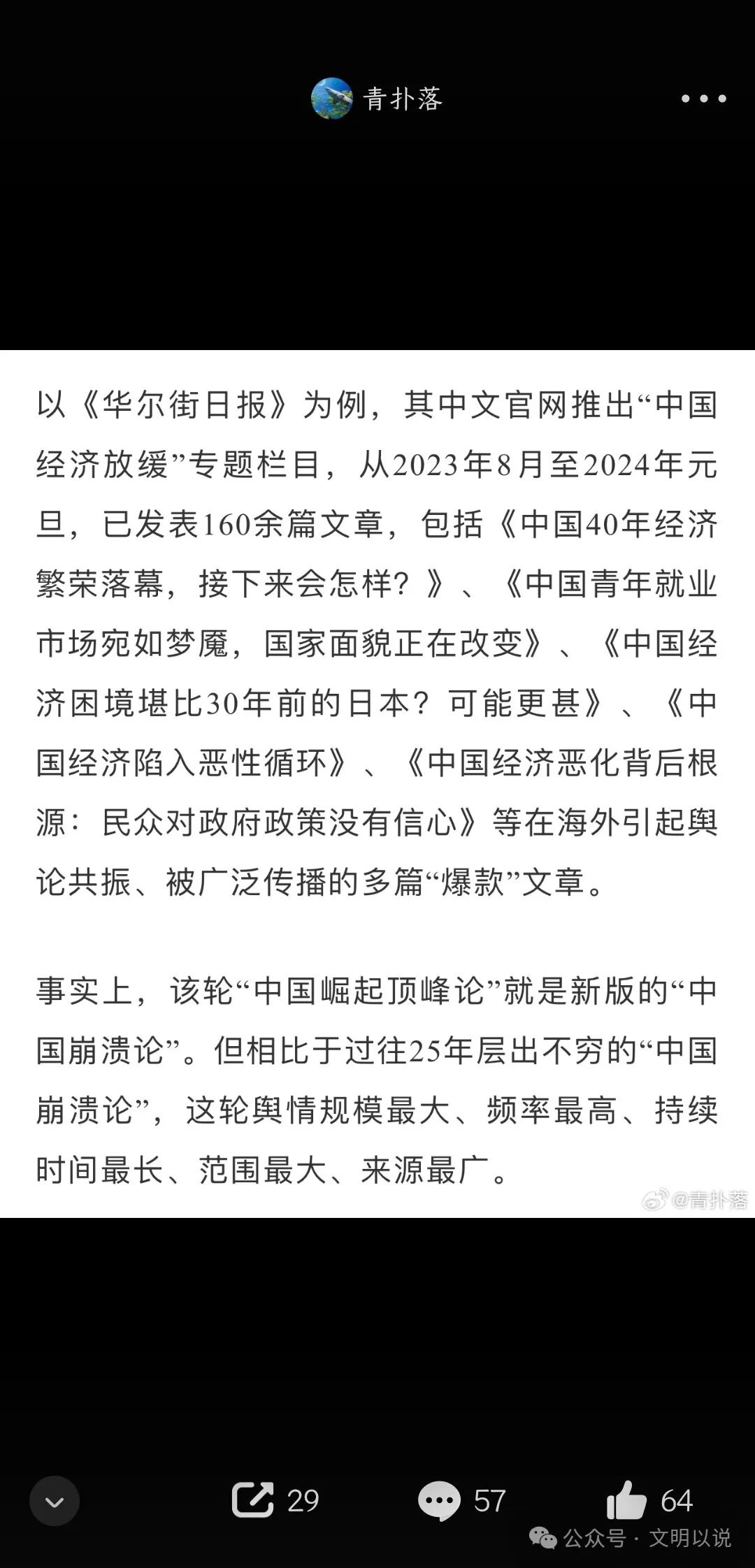 这是中、美体系化斗争最后的重要领域。依附性金融从业者的利益就来自于中美金融的不平等关系;当然,这也是美国的重大利益所在。两种力量内外勾连,动用各种资源,干扰、破坏金融自主化进程。比如,美国媒体在世界范围内制造 “中国崛起顶峰论”,削弱国人和世人对中国的信心。以北京的某知名财经媒体为代表的国内财经媒体,也与之里应外合。最近一轮股市下行,就是对我们提出建设金融强国的一次大反击,带有很强政治性。